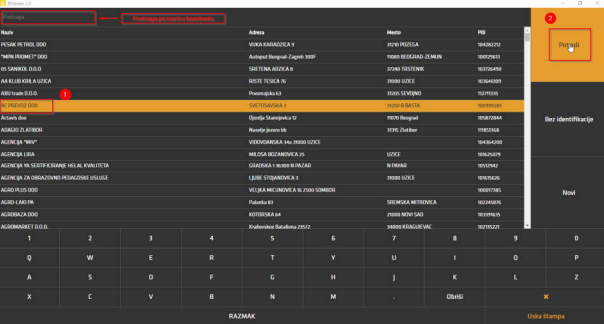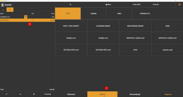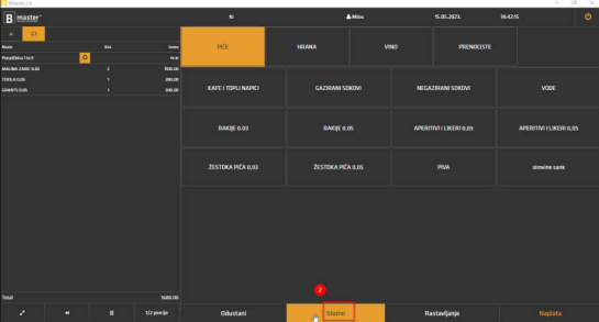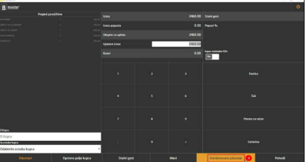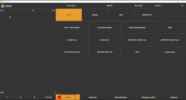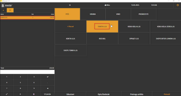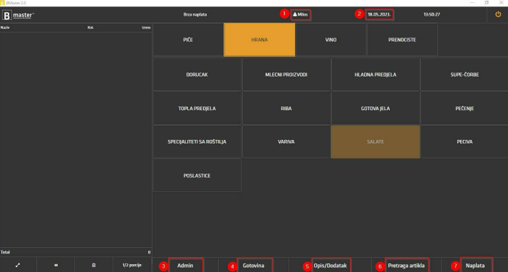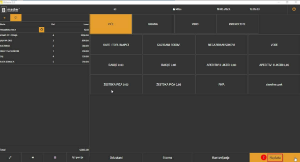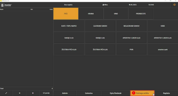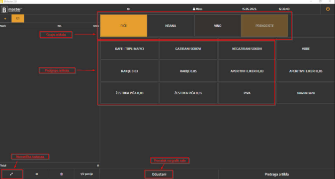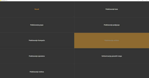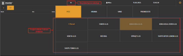 Nakon toga, otvara se novi ekran koji sadrži pregled grupa i podgrupa artikala, pristup numeričkoj tastaturi kao i povratak na prethodnu stranu, odnosno grafik sale.