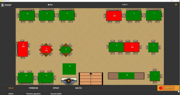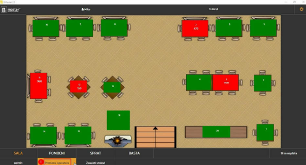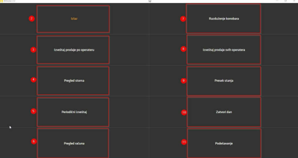 Nakon uspešne prijave, otvara se osnovni ekran. Osnovni ekran može biti bez i sa stolovima, zavisno od potrebe korisnika odnosno tipa delatnosti (kafić, restoran, trgovina, pekara, fast food itd).