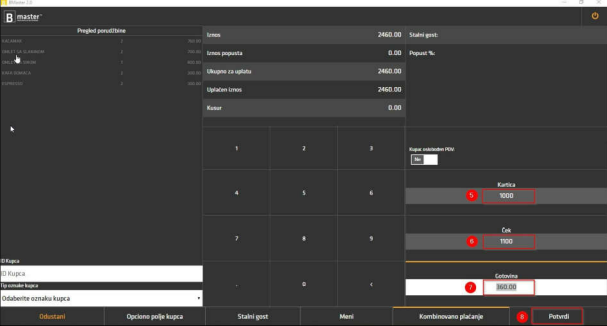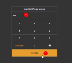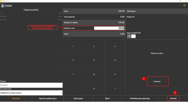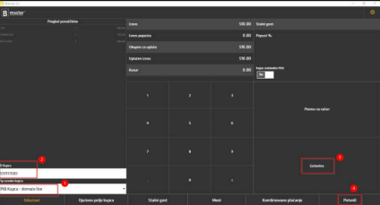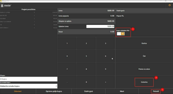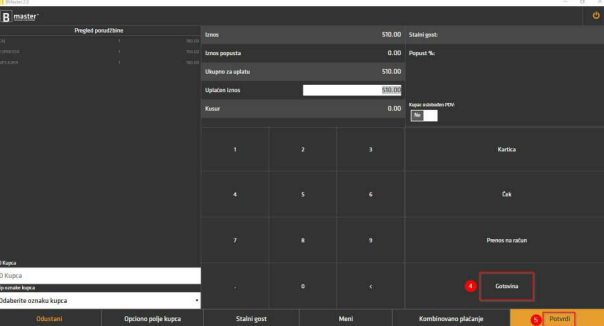 4) Gotovina se koristi direktno iz ekrana ukoliko se koristi taj način plaćanja, I automatski se izdaje