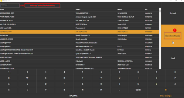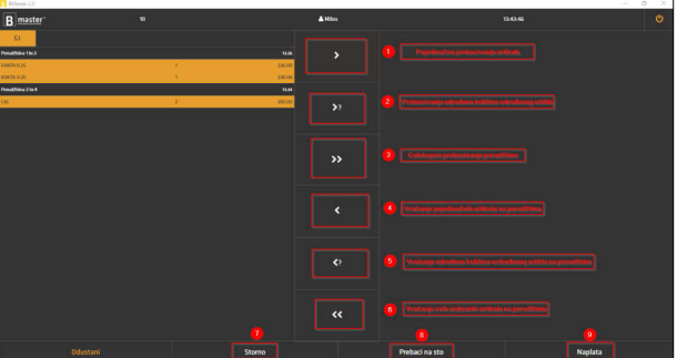 Osnovne funkcionalnosti ekrana bez stolova / ekrana brzu naplatu: