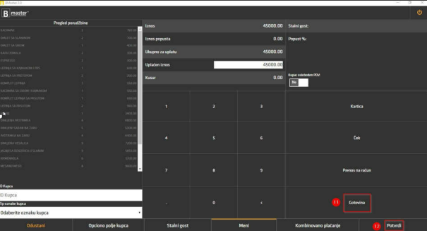 10) Nakon potvrde otvara se ekran za NAPLATU koji omogućava odabir načina plaćanja
