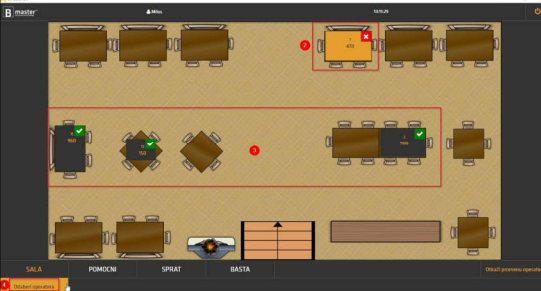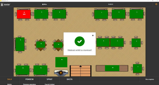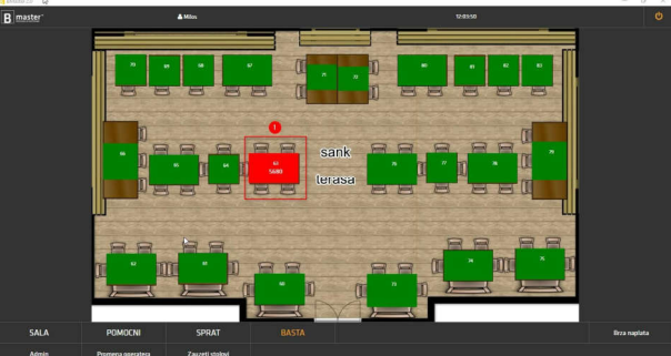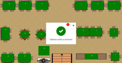 Klikom na dugme potvrdi, izabrani artikli postaju deo porudžbine i zadužuje se izabrani sto, koji je vidljiv na grafiku sale, kao prema slici.