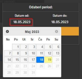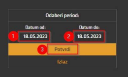 Klikom na datum otvara se kalendar i moguće je selektovati datum, ili ga uneti korišćenjem numeričke tastature. Klikom na dugme POTVRDI, generiše se izveštaj za traženi period.