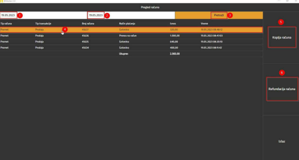 Kroz funkcionalnost PREGLED RAČUNA korisnici mogu da izvrše proveru svih računa izdatih za traženi period, izvaditi kopiju računa, kao i izvršiti refundaciju računa.