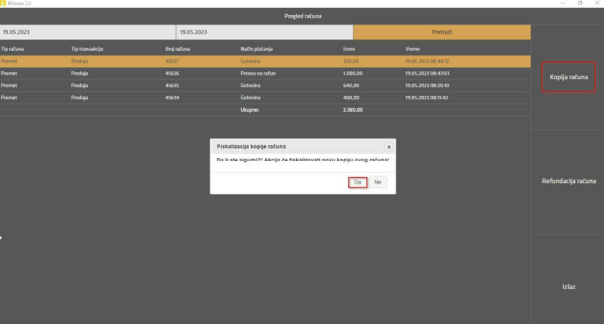 Kada se klikne na kopija, u poreskoj upravi se fiskalizuje kopija tog računa sa naznakom na računu OVO
