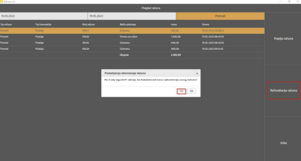 Kada se klikne na Refundacija, u poreskoj upravi se taj račun refundira/stornira, a stavke sa tog računa se