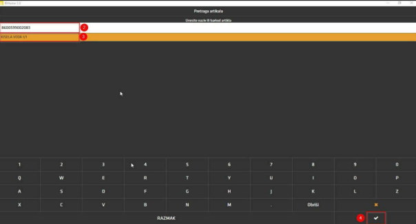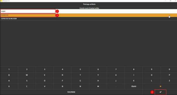 2) Kliknite na željeni artikal iz pretrage (samo ukoliko se barkod šifra unosi ručno)