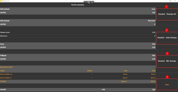 Izveštaj omogućava pregled prodaje svih operatera za dan na koji se pokreće. Štampa izveštaja moguća je u A4 formatu i uskoj štampi. Odabirom tipa štampe, izveštaj se automatski generiše i štampa.