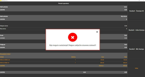 Napomena: Ukoliko u momentu pokretanja funkcionalnosti razduženja postoje nezaključeni (otvoreni) stolovi, razduženje neće biti moguće. U tom slučaju, prijavljeni operater dobiće sledeću poruku. Sve dok se svi stolovi/porudžbine ne zatvore, razduženje neće biti moguće.