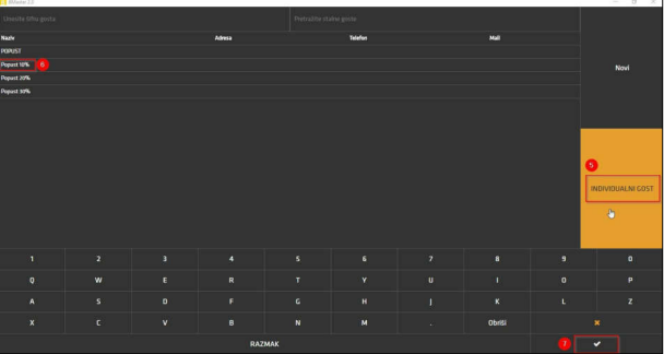 6) Klikom se vrši odabir stalnog gosta/komitenta ili definisanog procenta popusta