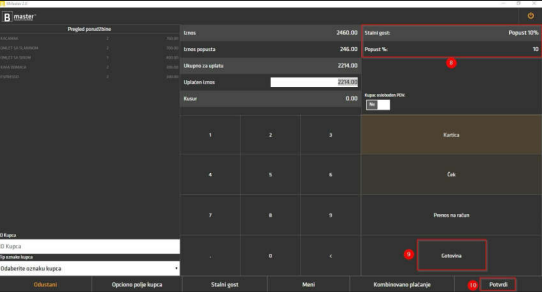 8) Prikaz komitenta/stalnog gosta i procenta popusta pre izdavanja računa/naplate