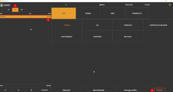 možete koristiti opciju G1, G2, G3... a u zavisnosti od broja gostiju/naručenih tura po datom stolu. Na sledećim